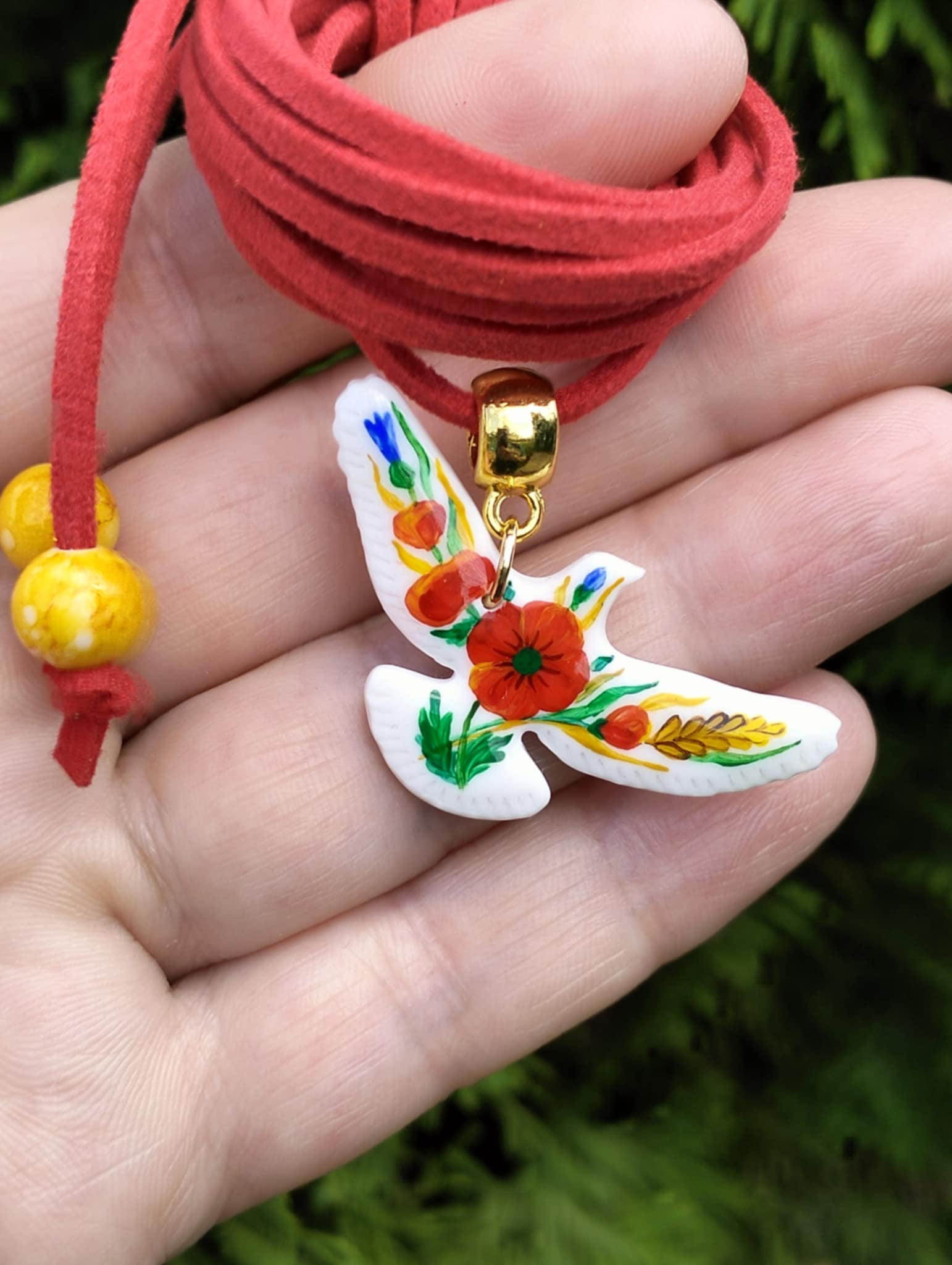Hand-made and hand-painted pendant depicting a dove- symbol of peace.