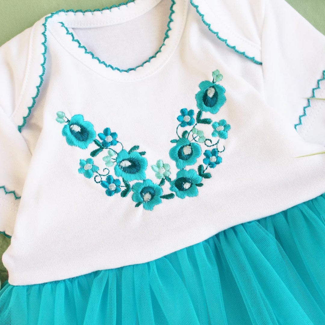 Charming baby dress set featuring a soft white long-sleeve bodice with colorful floral embroidery and a delicate turquoise tulle skirt. Finished with scalloped trim details and paired with a matching tulle headband, this outfit is perfect for special occasions, photos, or festive celebrations.