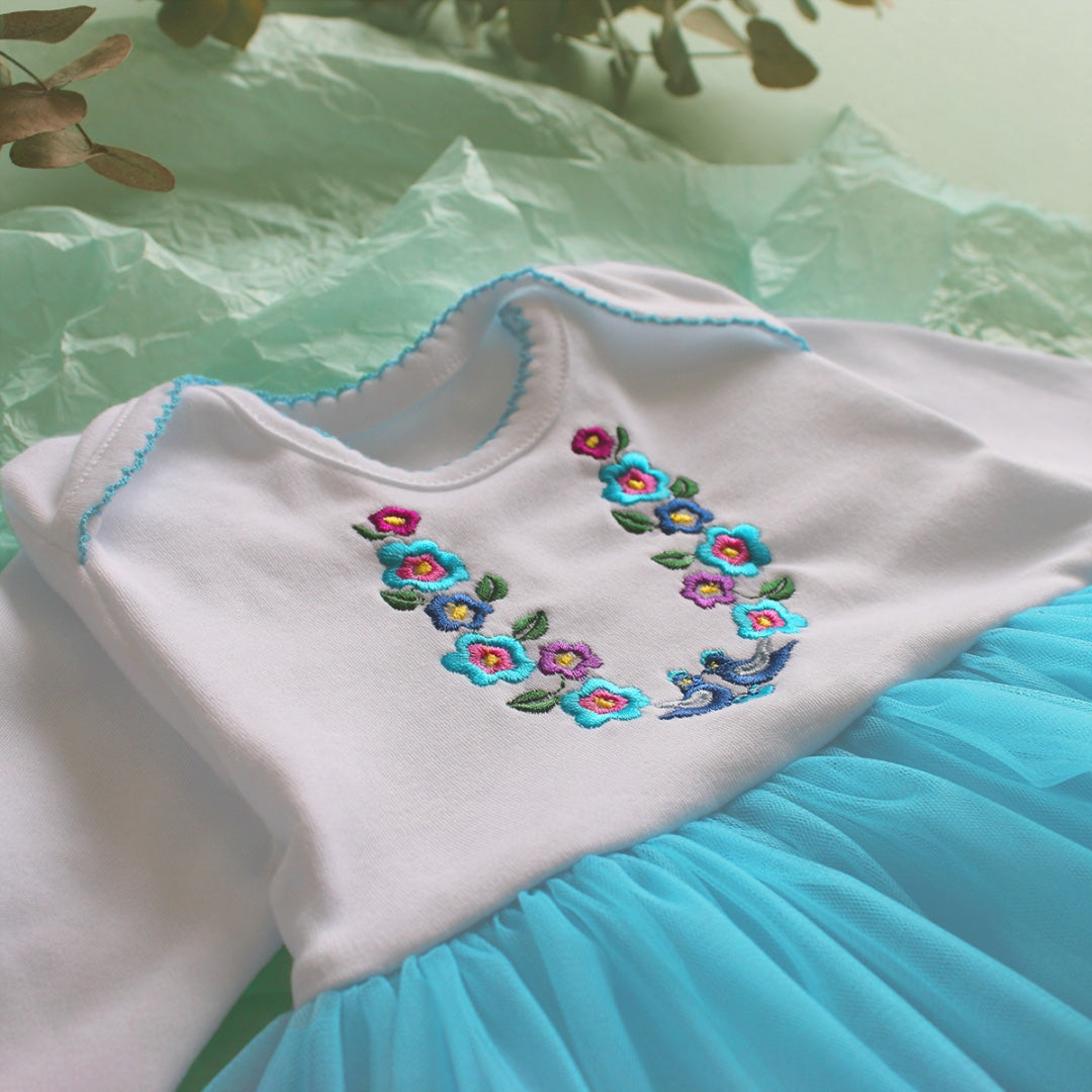 Charming baby dress set featuring a soft white long-sleeve bodice with colorful floral embroidery and a delicate turquoise tulle skirt. Finished with scalloped trim details and paired with a matching tulle headband, this outfit is perfect for special occasions, photos, or festive celebrations.