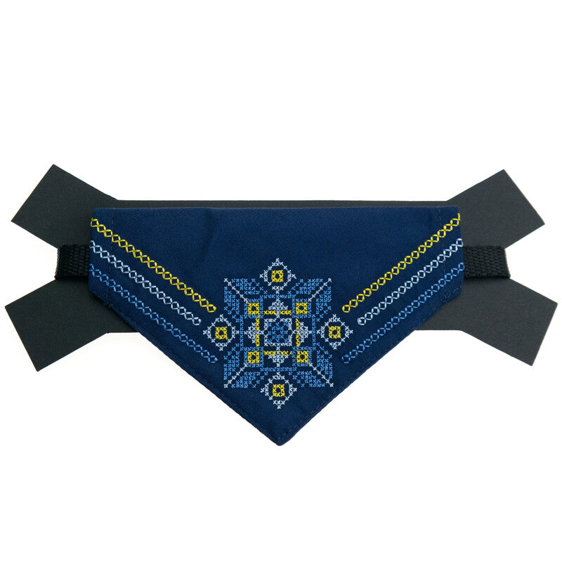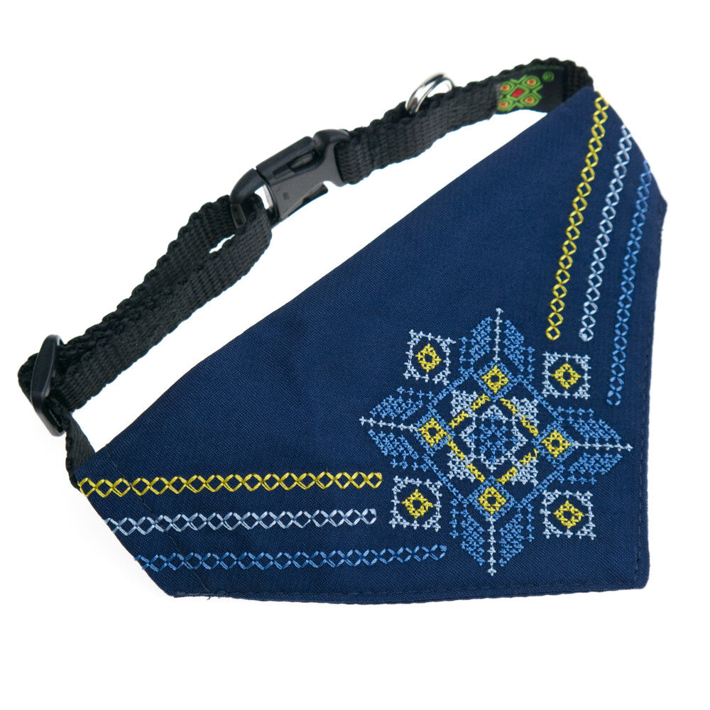 Designed with love and crafted with care, this collar is made especially for your four-legged friend. Featuring a charming blue and yellow embroidered bandana made from premium suiting fabric, this stylish accessory turns every walk into a special occasion. The sturdy base ensures your pet stays comfortable and secure.