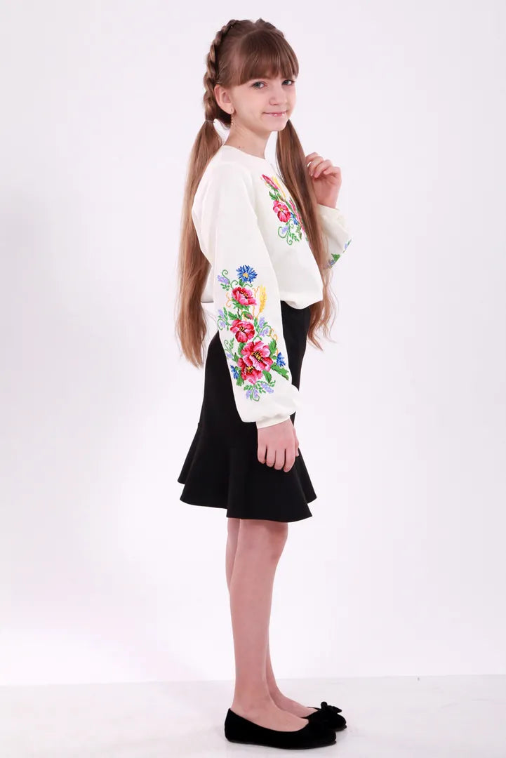 Beautiful girl's blouse with rich embroidery of traditional Ukrainian flowers such as poppies, cornflowers and sheets of wheat on front and sleeves.